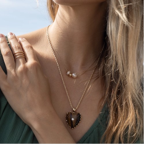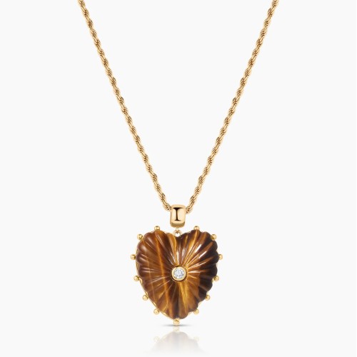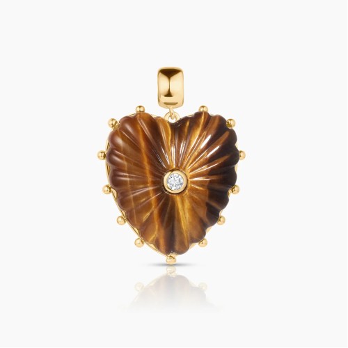 Our Malene heart charm in luxe tiger's eye—hand-carved stone, cubic zirconia, and high-shine gold on a large round bail for versatility. Everything you want and need to make a statement.