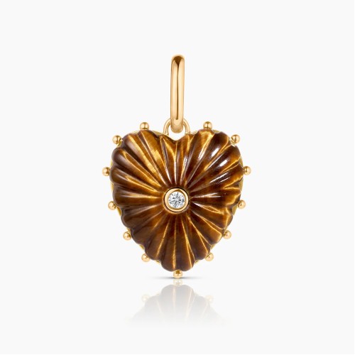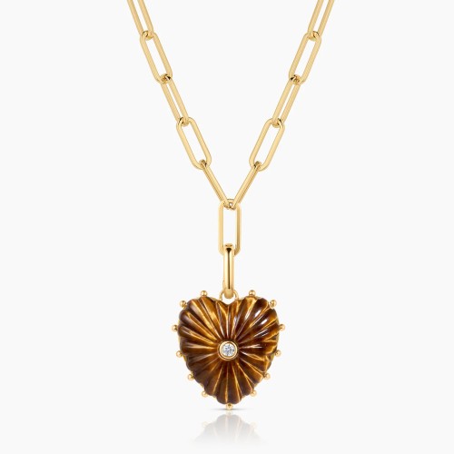 This super adjustable paperclip chain is elevated to new heights with our Malene heart charm in tiger's eye. Hand-carved stone, cubic zirconia, and high-shine gold. Everything you want and need in a statement necklace.