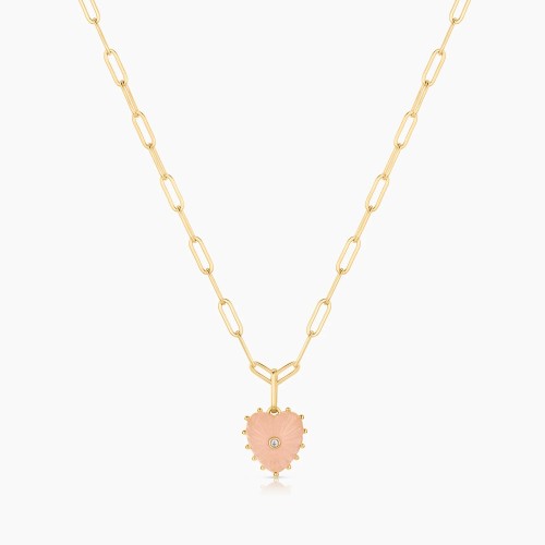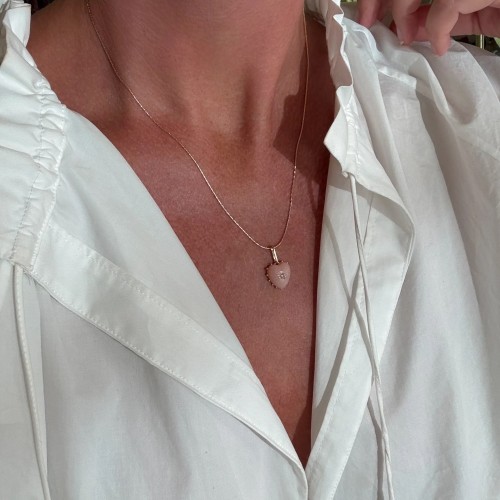 She's Malene's baby sister, a smaller hand-carved pink jade heart charm with a sparkling center stone. A favorite for gifting and layering.