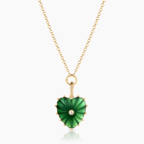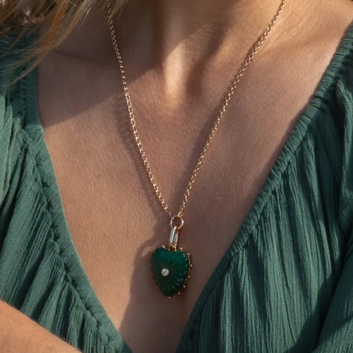 Our Malene heart charm in soothing jade—hand-carved stone, cubic zirconia, and high-shine gold on a hinge clip for removability. Everything you want and need to make a statement.